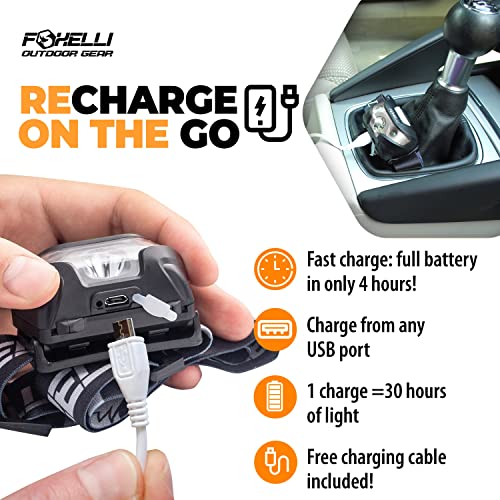 - USB RECHARGEABLE - Charge fully from any USB port in only 4 hours! Foxelli LED headlamp provides up to 30 hours of constant light on a single charge. Micro USB charging cable included. Enjoy with the whole family - one of the best headlamps for adults and kids!